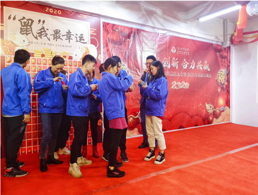 公司全体员工齐聚一堂,其乐融融,静候这一年一度的年终总结大会,携手共赴2020年新年跨年晚宴。